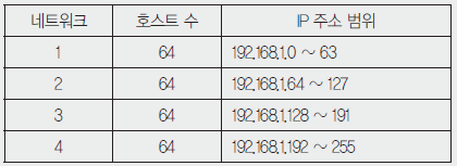 • 호스트ID가 6Bit로 설정되었고, 문제에서 FLSM 방식을 이용한다고 했으므로 4개의 네트워크에 고정된 크기인 64개(2^6=64)씩 할당하면 다음과 같습니다.
