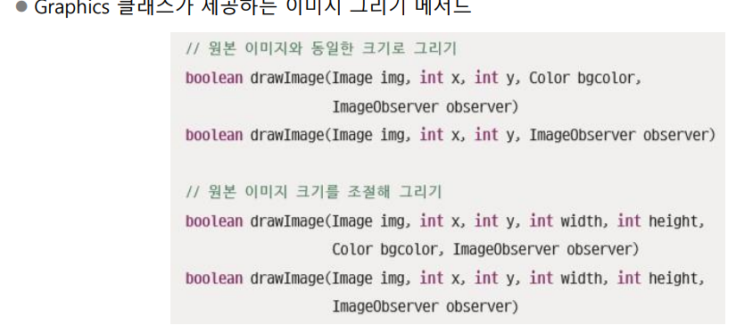 Graphics 클래스는 자바에서 그리기 작업을 할 때 필요한 도구로 AWT뿐만 아니라 스윙에서도 사용. 자바에서는 색상 선택 문자열 그리기, 도형 그리기, 도형 칠하기, 이미지 그리기, 클리핑 등을 지원하는 각종 메서드와 상수를 Graphics 클래스로 제공