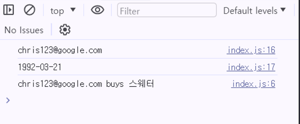 console.log(`${this.email} buys ${item.name}`); // this는 현재 객체인 user 객체 자체를 의미