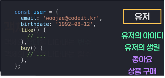 ex) 유저 - 변수: 유저의 아이디, 유저의 생일 / 함수: 좋아요, 상품 구매