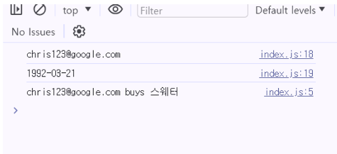 console.log(`${this.email} buys ${item.name}`); // this는 현재 객체인 user 객체 자체를 의미