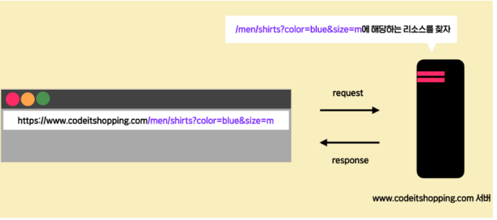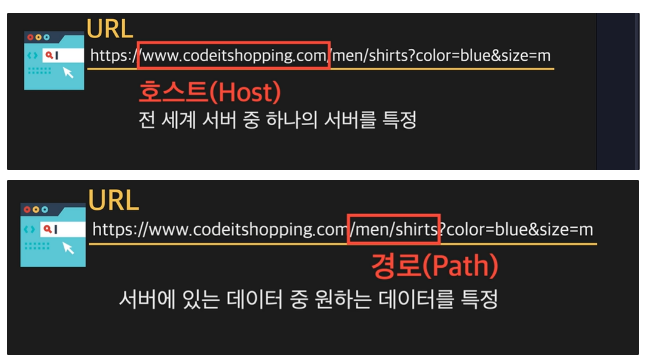 브라우저는 URL에서 호스트(host, 위 그림에서 www.codeitshopping.com에 해당하는 부분) 부분을 보고,