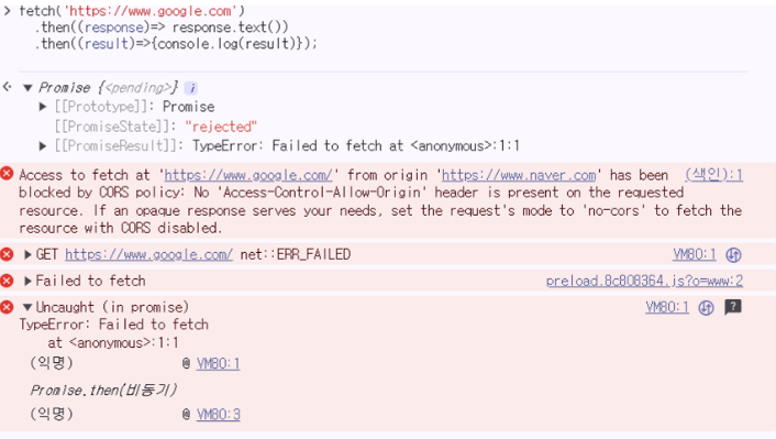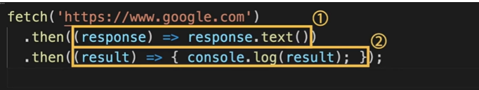 .then((response)=> response.text()) //리스폰스를 처리하는 부분 (서버에 리스폰스가 와야 실행됨)