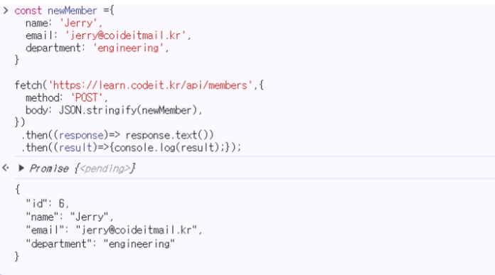 .then((result) => { console.log(result); });프로퍼티의 값으로는, 리퀘스트의 바디에 담을 데이터가 JSON 데이터라는 뜻으로 application/json 을 적는다