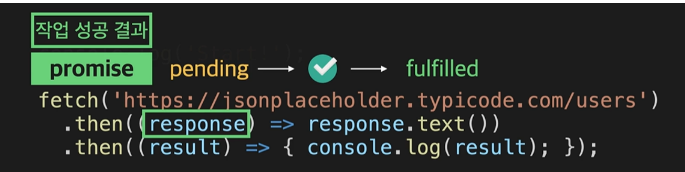 fetch 함수로 리스폰스를 잘 받으면, response 객체의 text 메소드는, fulfilled 상태이면서 리스폰스의 바디에 있는 내용을 string 타입으로 변환한 값을 '작업 성공 결과'로 가진 Promise 객체를 리턴