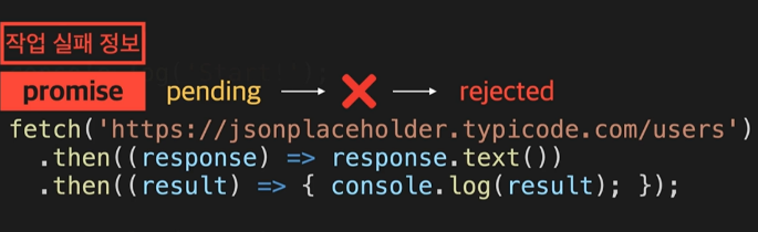 • pending 에서 rejected가 되면 promise 객체는 작업 실패의 이유에 관한 정보를 갖게된다