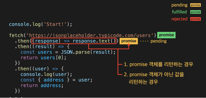 • then 메소드가 리턴했던 promise 객체는 fulfiled 상태가 되고 콜백의 리턴값을 작업 성공 결과로 갖게 된다