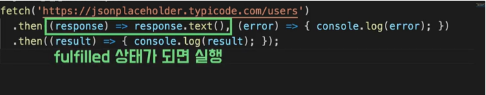 .then((response)=>response.text()) // fulfiled 일때 실행할 콜백 등록