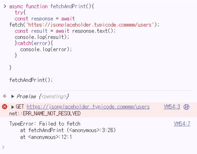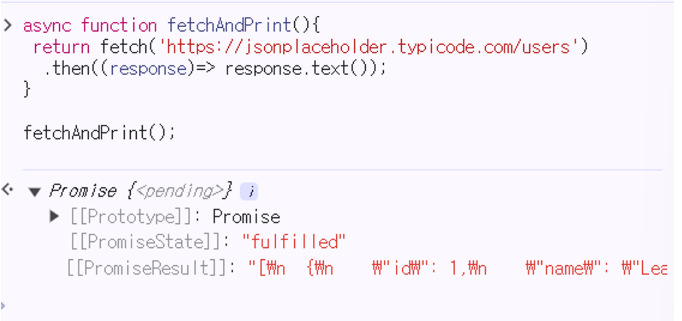 - await을 만나면 뒤의 코드를 실행하고 코드의 실행흐름은 fetchAndPrint 함수 뒤로 바뀐다