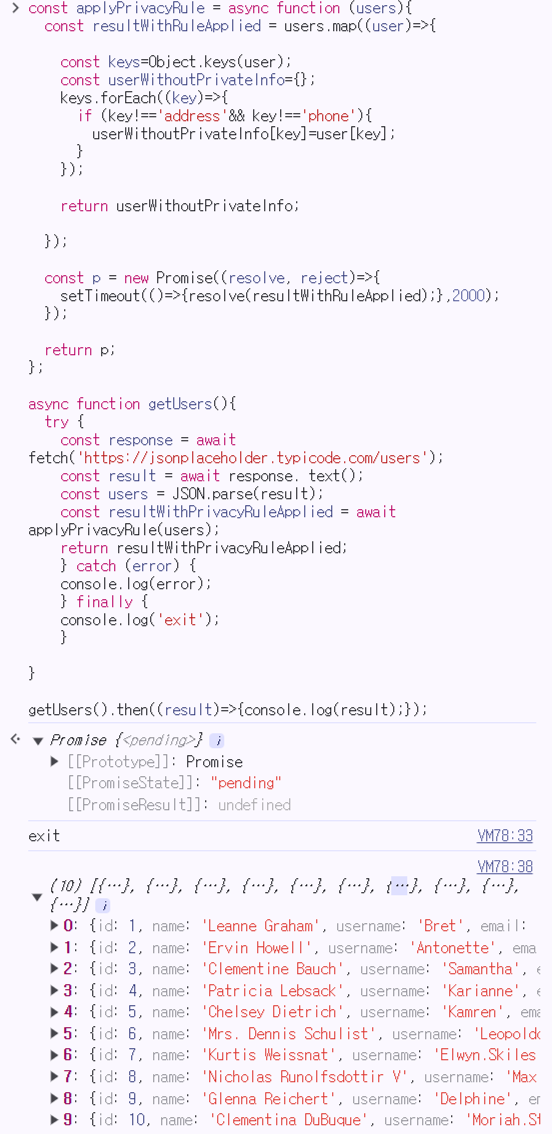 - 그 다음 await에서 fulfiled가 될 때까지 기다린다음 그다음 코드 result가 출력된다