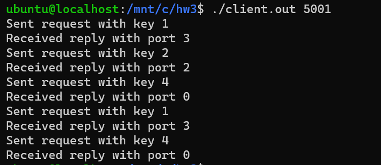 클라이언트는 0~4의 범위를 가지는 난수가 들어가는 응용 계층 헤더 필드 key를 패킷에 담아 라우터에게 보낸다. 이 때, 터미널에 해당 key 값을 출력해준다.