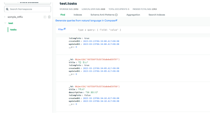 await Task.insertMany(data); // 삽입할 데이터를 파라미터로 받는다
