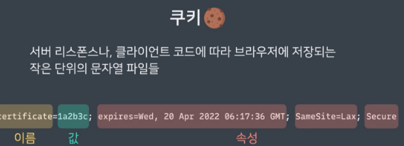 🔹서버 리스폰스나, 클라이언트 코드에 따라 브라우저에 저장되는 작은 단위의 문자열 파일