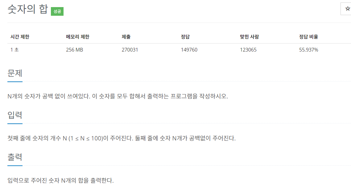 문자열 형태로 입력값을 받은 후 이를 문자 배열로 변환하고 문자 배열값을 순서대로 읽으면서 숫자형으로 변환하여 더해야한다.