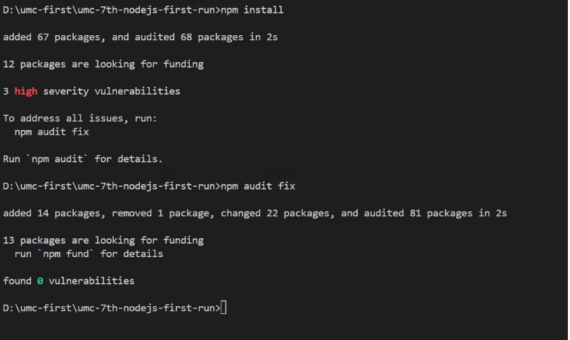 npm install 명령어를 사용하여 설치 후 3개의높은 심각도(high severity) 취약점이 발견되어 npm audit fix 명령어를 사용하여 취약점 자동 수정