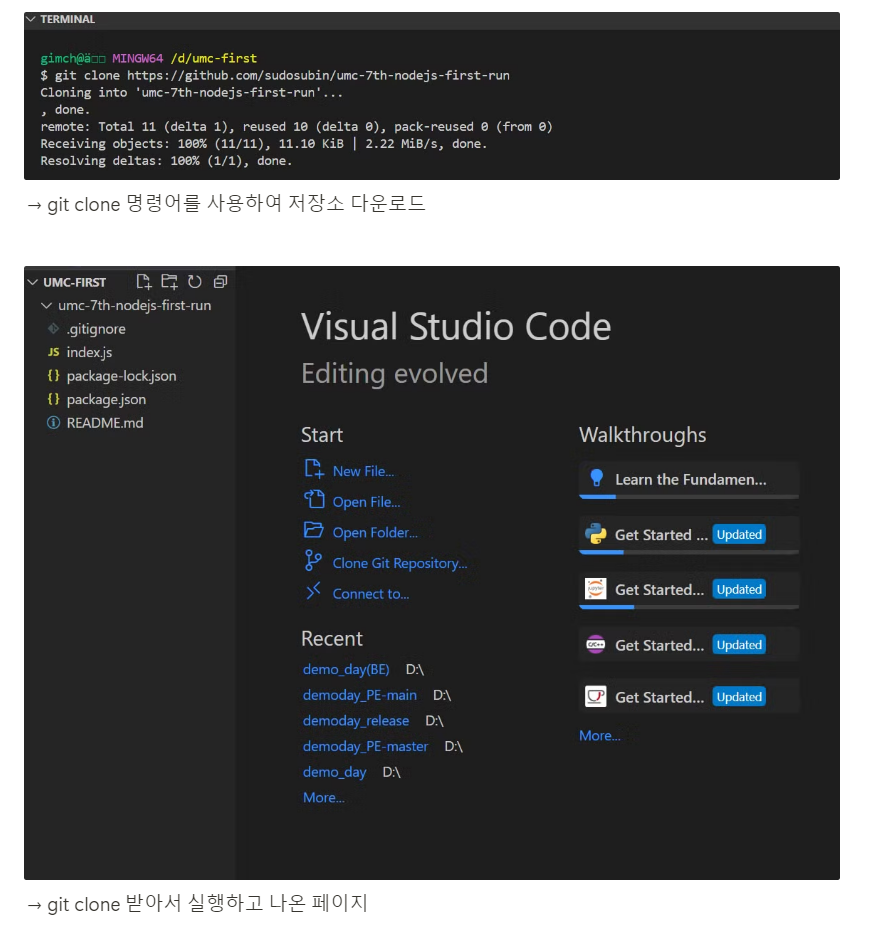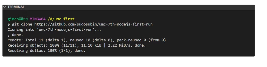 VS code 터미널에서 git clone https://github.com/sudosubin/umc-7th-nodejs-first-run 명령어를 사용해서 저장소 다운로드
